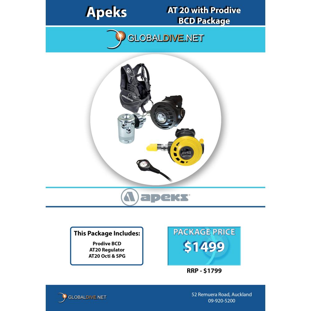 The Global Dive Apeks AT20/Prodive Reef Explorer BCD package is a great value solution providing a high quality Apeks balanced regulator set (1st stage/2nd stage/Octi/SPG) with a reliable jacket BCD.