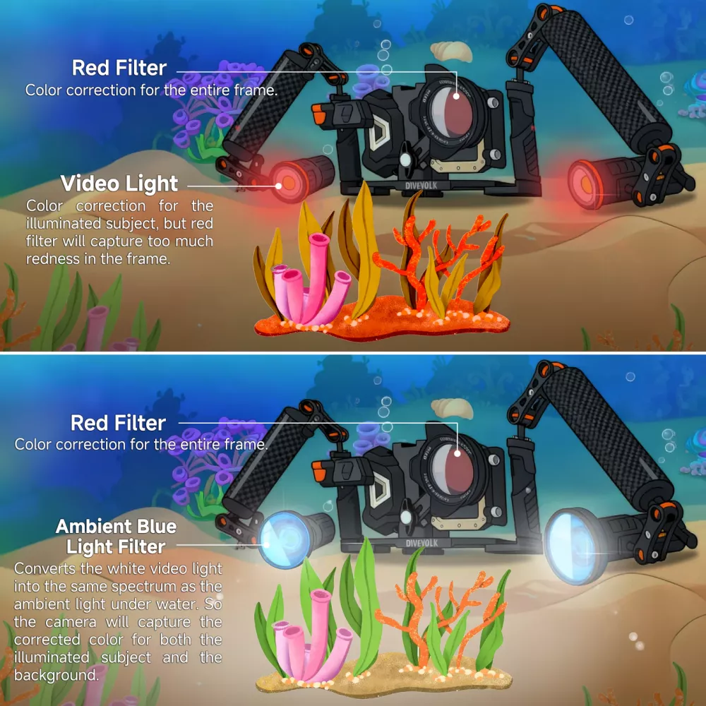 Optimised for depths between 5–20 metres, the ambient blue filter reduces excessive warm tones produced by powerful video lights, allowing colours to blend naturally with the surrounding environment. The result is cleaner colour reproduction, improved contrast, and footage that looks far more natural straight out of the camera.
