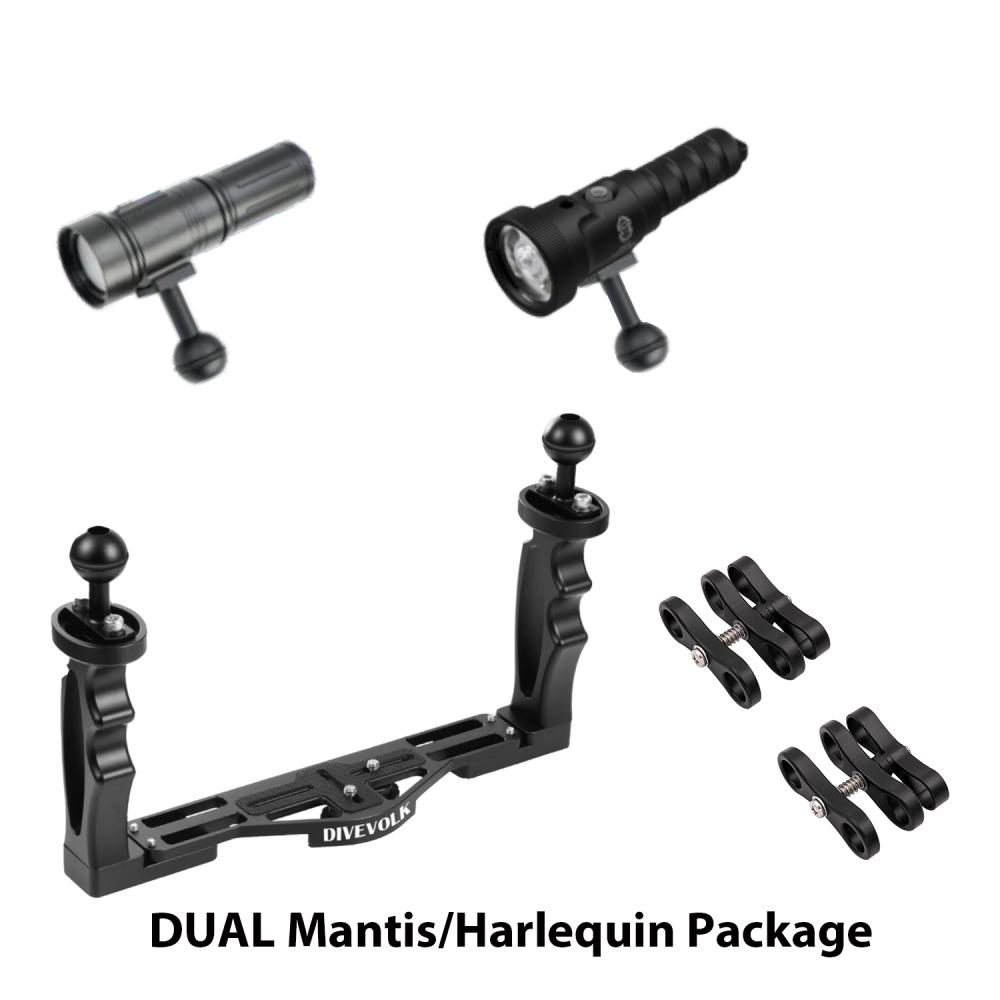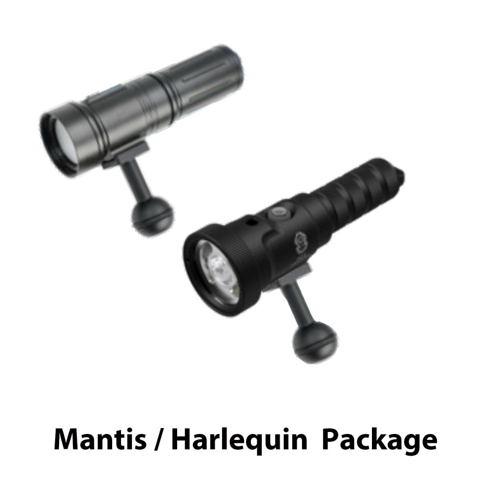 The Dual Mantis/Harlequin Package gives you the best of both worlds – simple reliability from the Harlequin, plus advanced versatility from the Mantis – all mounted on a stable, ergonomic tray system. Perfect for capturing colourful, high-quality underwater video on the go.