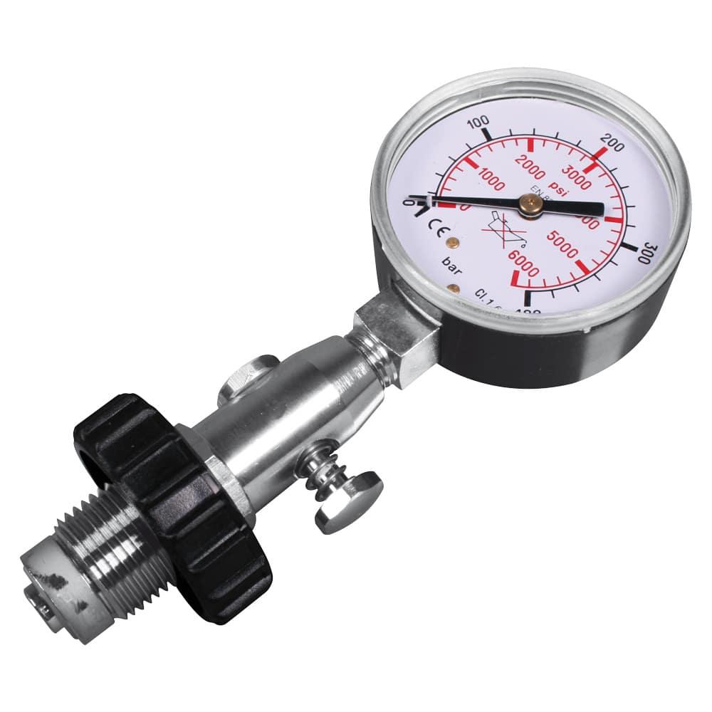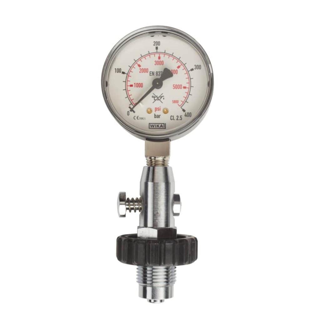 Constructed with a solid brass body and equipped with a DIN connection and integrated pressure relief valve, the OMS Pressure Testing Gauge ensures stable and safe operation even under high-pressure conditions. The easy-to-read analog dial provides precise pressure measurements, allowing for quick verification and peace of mind before any dive or fill procedure.