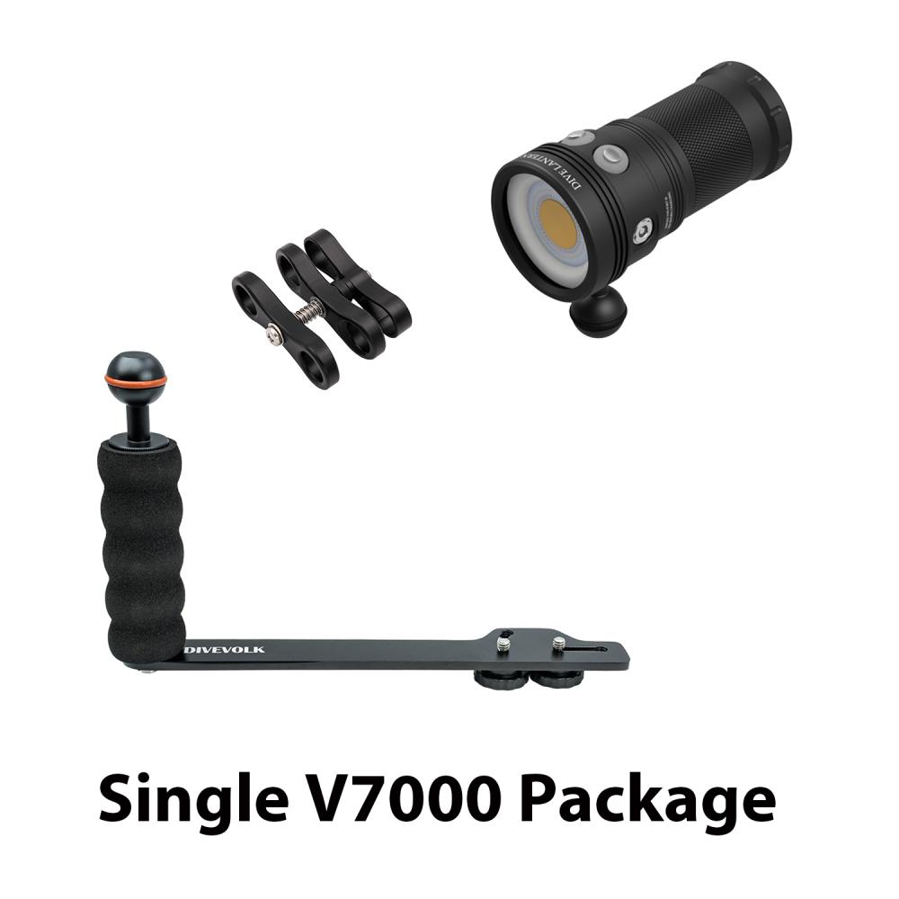 The Single V7000 Package is ideal for divers looking for a lightweight, travel-ready setup with serious lighting performance.